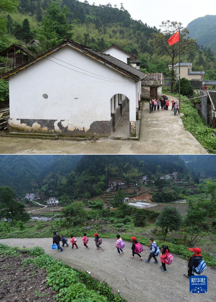 拼版照片:廣西全州縣蕉江瑤族鄉(xiāng)大源村委苦馬田教學(xué)點(diǎn)的盧加紅老師和學(xué)生一起升國旗(上圖),盧加紅老師中午放學(xué)后護(hù)送學(xué)生回家(下圖)(2016年4月28日攝)。當(dāng)時,盧加紅是苦馬田教學(xué)點(diǎn)唯一的老師。