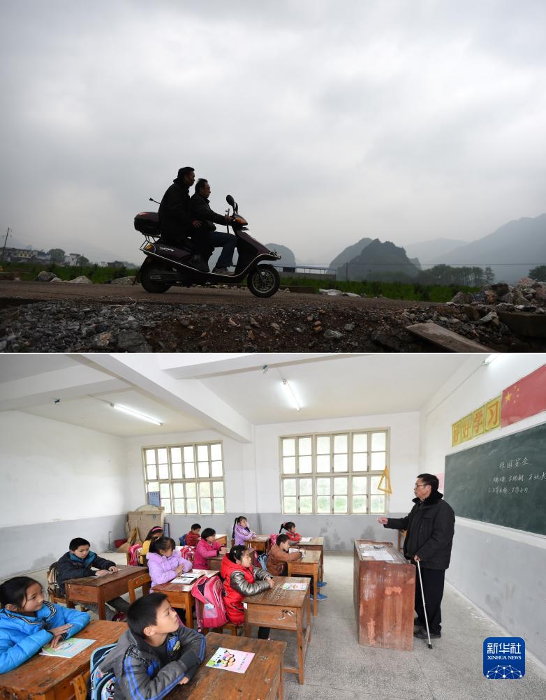 拼版照片:廣西灌陽縣洞井瑤族鄉桂平巖小學的趙仁斌老師(前)用電動自行車載著楊大杰老師去學校(上圖),廣西灌陽縣洞井瑤族鄉桂平巖小學的楊大杰老師給學生們上課(下圖)(2016年3月24日攝)。2015年3月,廣西灌陽縣洞井瑤族鄉桂平巖小學楊大杰老師被診斷為股骨頭壞死,經過一段時間治療后,堅持回到教學崗位上。由于病情未被根治,他每走5分鐘的路就要坐下來休息,學校同事每天輪流接送他上下班。