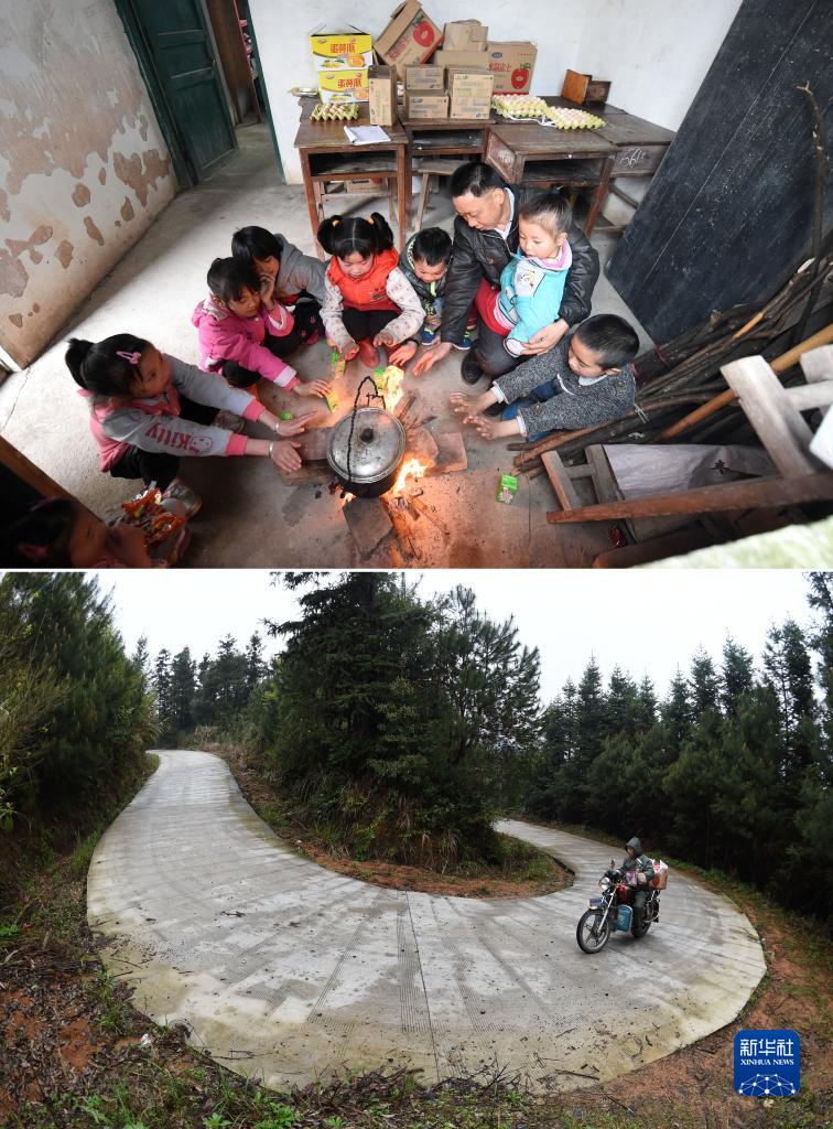 拼版照片:廣西灌陽縣洞井瑤族鄉野豬殿村小學的周運雄老師(右三)和學生邊烤火邊煮雞蛋(上圖),周運雄老師騎摩托車載著學生營養餐趕回學校(下圖)(2016年3月23日攝)。時年58歲的周運雄是野豬殿村小學校長,也是學校的兩名老師之一。他常常要騎摩托車翻越25公里山路到鄉政府領取學生營養餐食材。