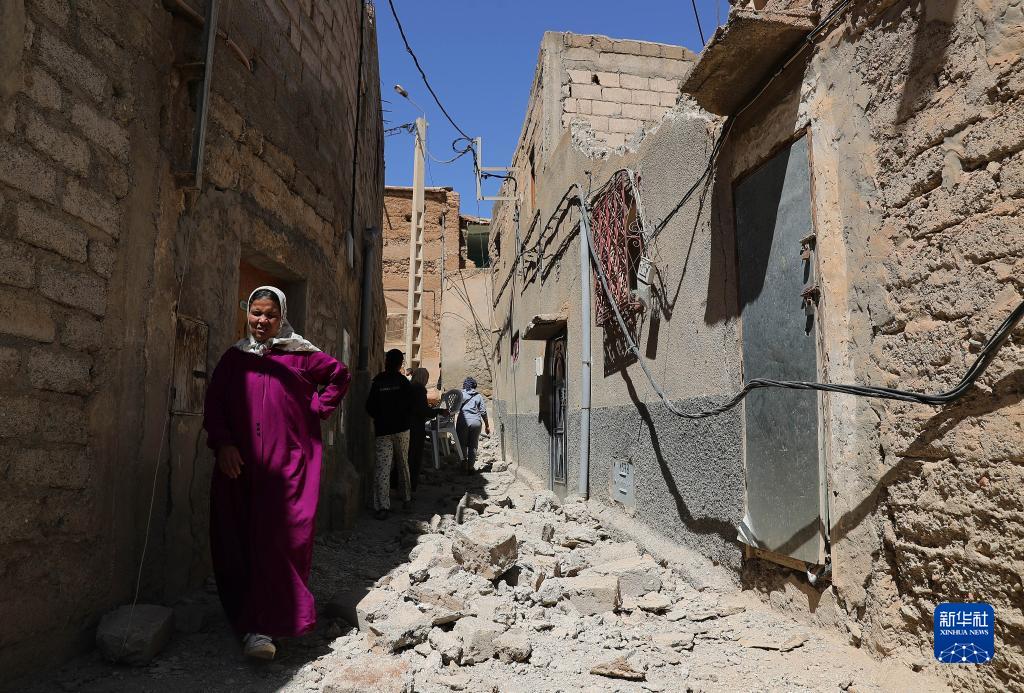 9月10日,在摩洛哥震中附近的艾米茲米茲村,人們從受損建筑旁經(jīng)過。