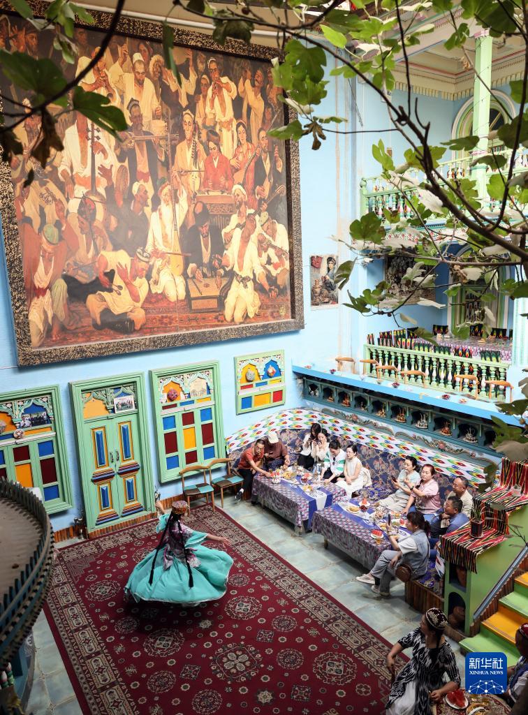 在新疆喀什古城景區“古麗的家”旅游家訪點,演員在隨音樂起舞(9月7日攝)。