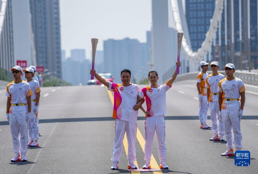 9月11日,火炬手沈振霖(右)和黃黎明在火炬傳遞中。