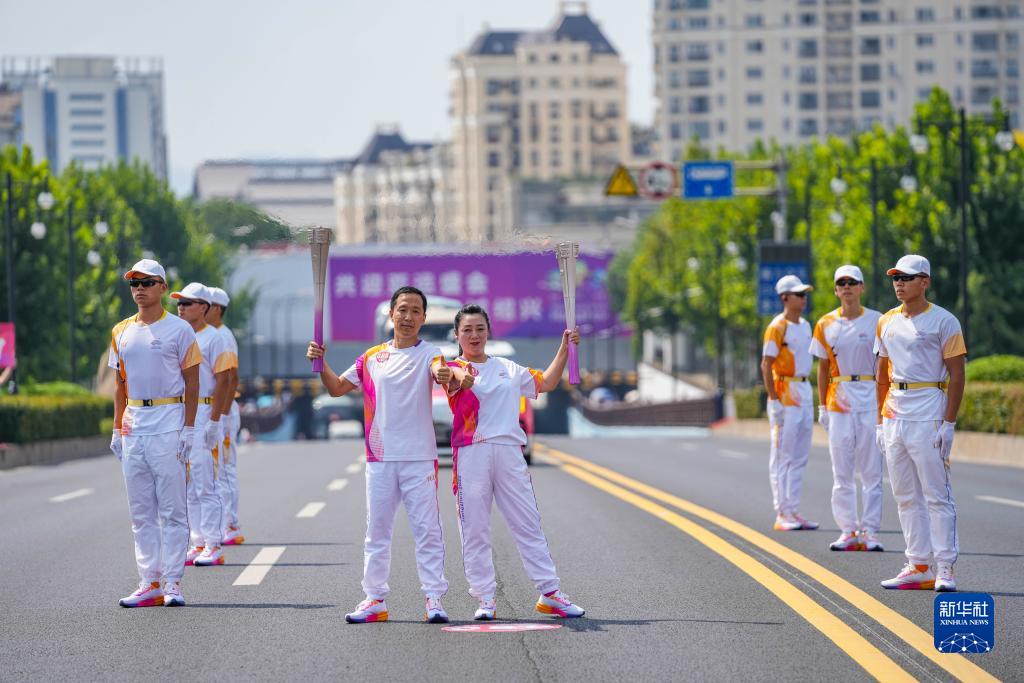 9月11日,火炬手單杰(左)和張迪在火炬傳遞中。