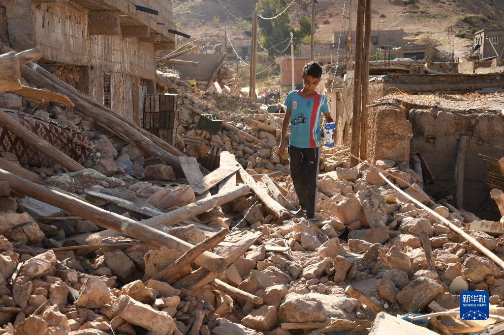 9月10日,在摩洛哥震中附近的艾米茲米茲村,一名男孩從損毀的建筑上走過。
