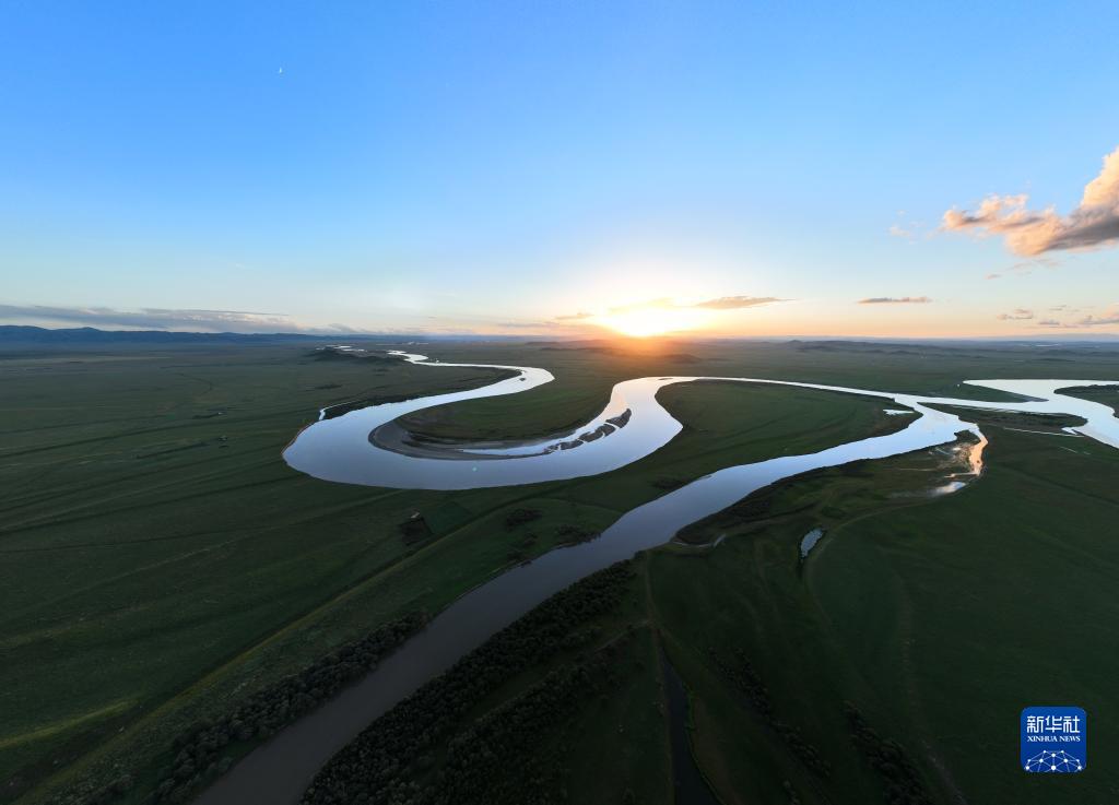 這是8月21日在四川省阿壩藏族羌族自治州若爾蓋縣唐克鎮(zhèn)拍攝的黃河九曲第一灣落日(無人機(jī)照片)。