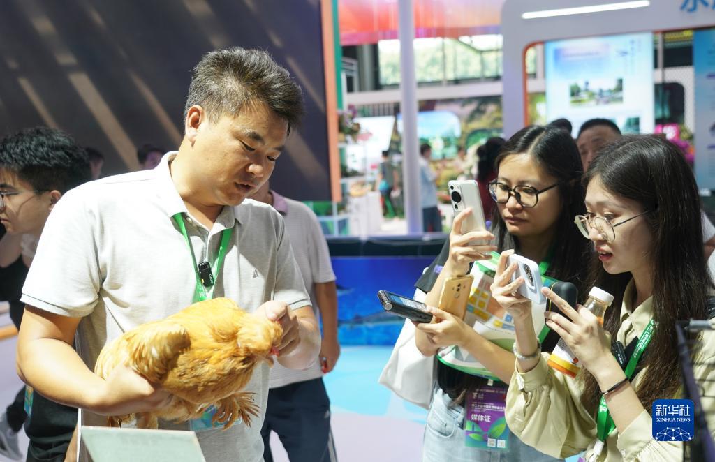 9月11日,在第三十屆中國北京種業大會種業振興成果展現場,工作人員(前左)向媒體記者介紹北京油雞。