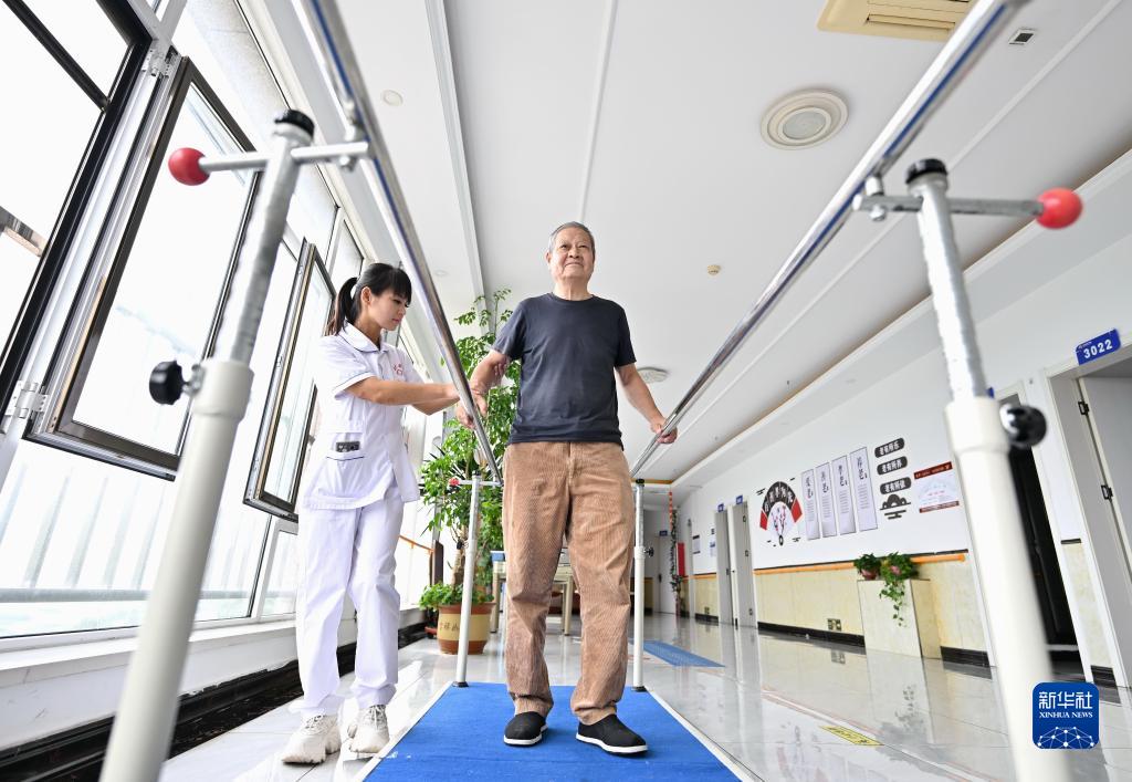 9月11日,在河北省灤州市王店子鎮海洋養老中心,醫務人員在指導一位老人進行康復訓練。