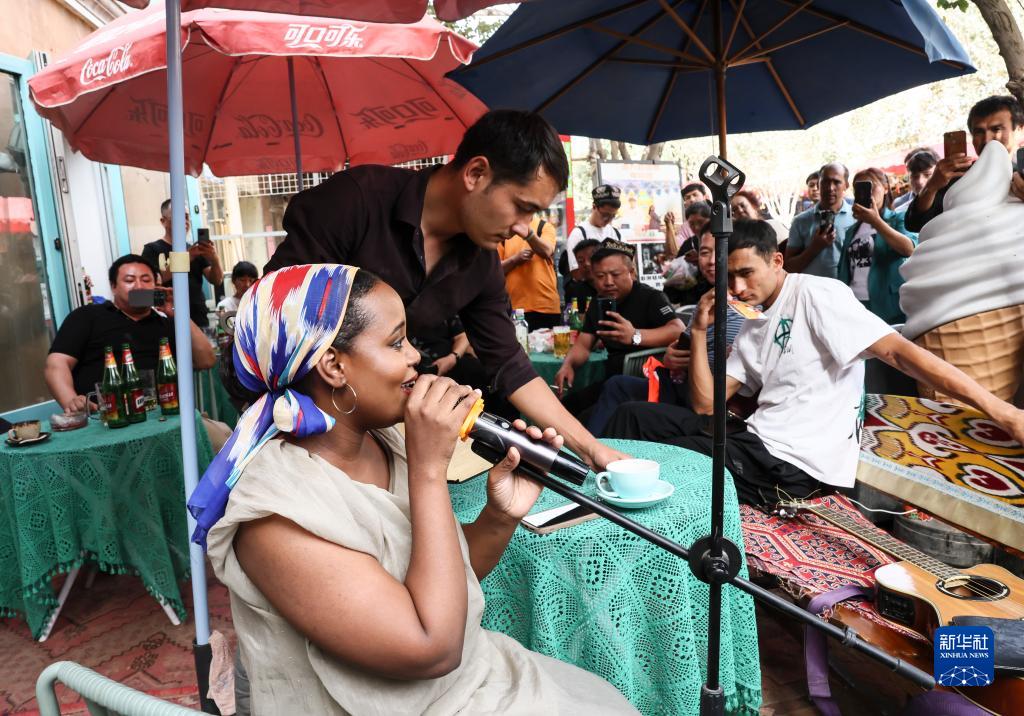 海迪雅在自家咖啡館前唱歌,丈夫迪力夏提為其端來一杯飲品(9月7日攝)。