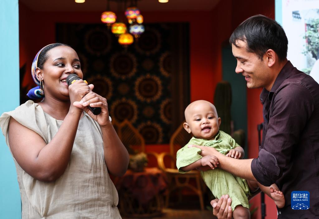 海迪雅在自家咖啡館前唱歌,丈夫迪力夏提抱著孩子與她互動(9月7日攝)。