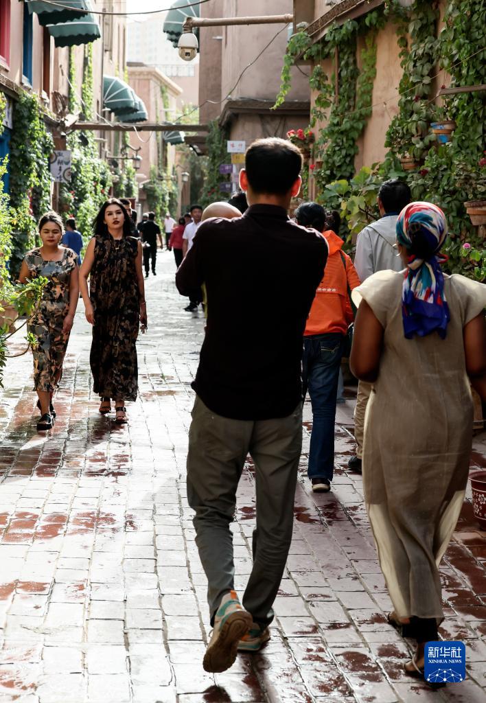迪力夏提(前左)抱著孩子和海迪雅走在喀什古城景區的巷道內(9月7日攝)。