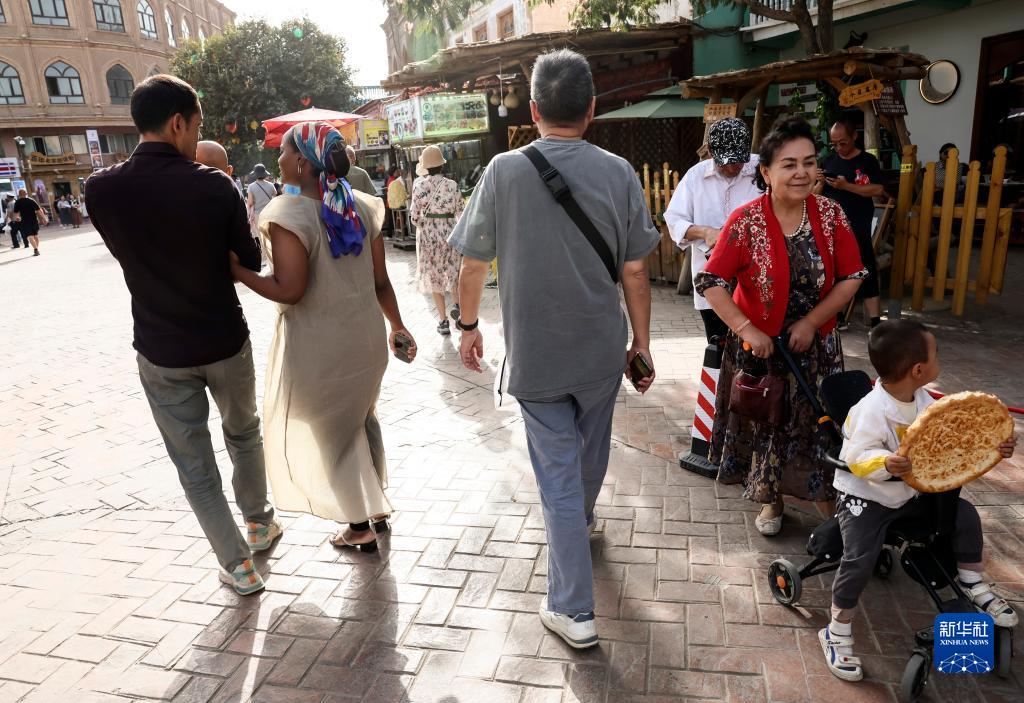 迪力夏提(左)抱著孩子和海迪雅走在喀什古城景區的巷道內(9月7日攝)。
