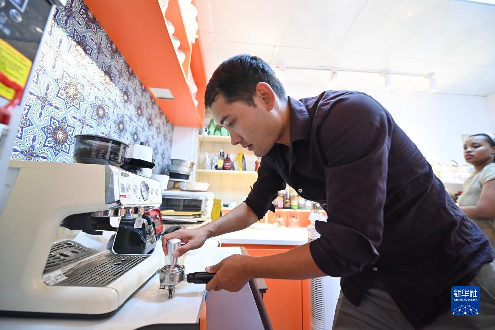 迪力夏提(左)和海迪雅在自家咖啡館內(nèi)為顧客制作咖啡(9月7日攝)。