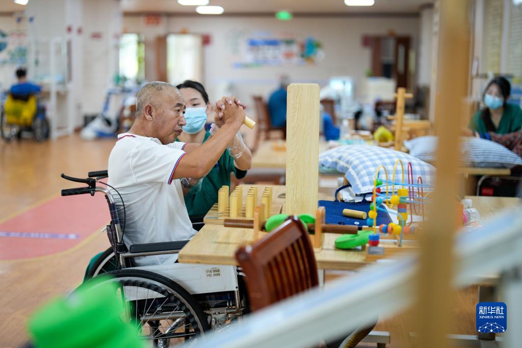 9月12日,河北省唐山市古冶區一家養老機構的工作人員指導老人進行手部康復訓練。
