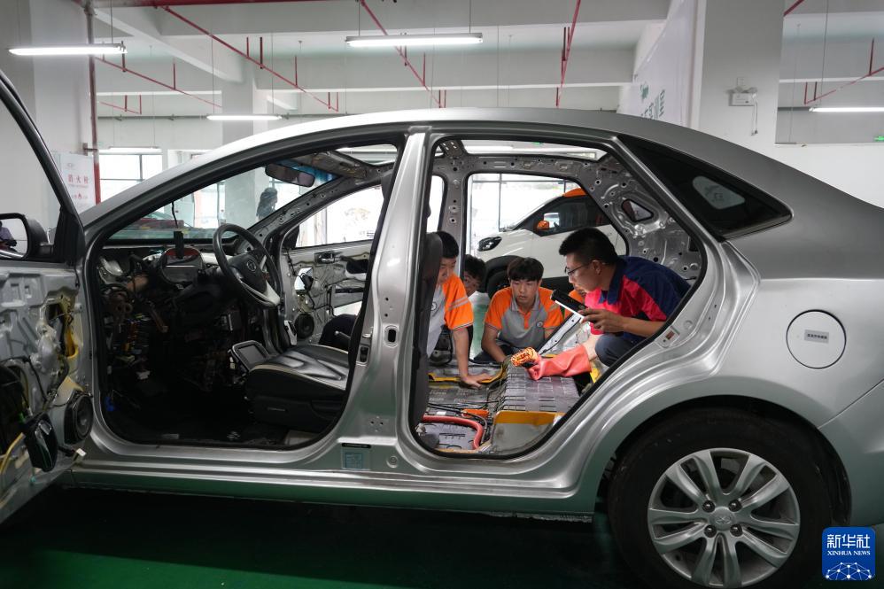 9月12日,在重慶市北碚區職業教育中心新能源汽修實訓室,教師(右一)在給學生講解新能源汽車維修知識。