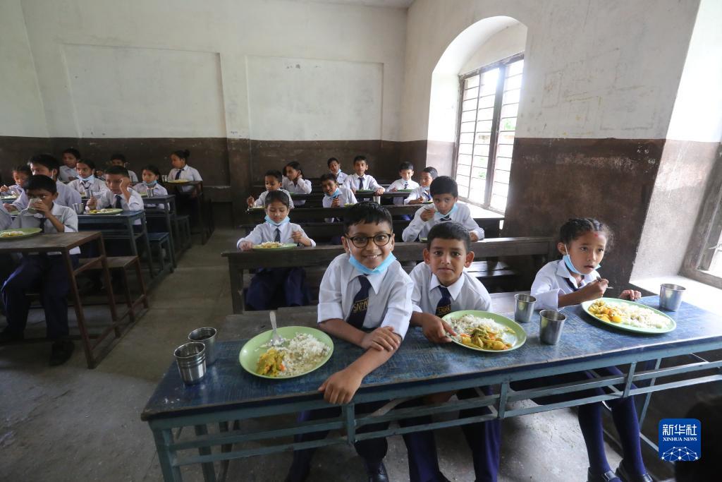 這是2022年7月11日,在尼泊爾加德滿都,學生在微笑兒童項目啟動儀式后就餐。由“全球發展和南南合作基金”支持的微笑兒童項目啟動儀式7月11日在尼泊爾首都加德滿都一所中學舉行,項目惠及3600名尼泊爾學生。