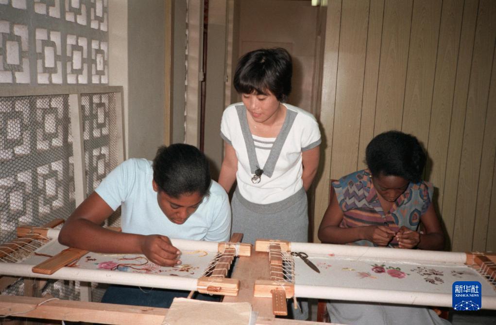 這是中國刺繡技術人員張建向巴巴多斯學員傳授刺繡針法(1986年攝)。當地工藝美術工人經過一年培訓,基本上掌握了中國刺繡的傳統工藝,使得具有悠久歷史的中國刺繡在這個加勒比海島國開花結果。