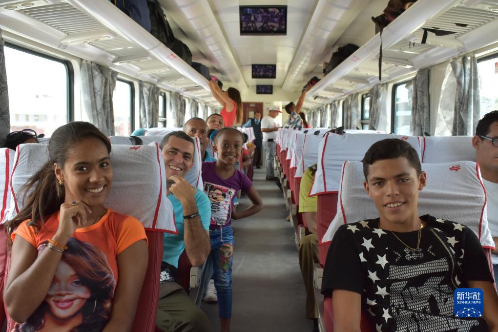 這是2019年7月13日,在古巴首都哈瓦那,乘客們坐在一列由中國設計并生產的鐵路客車組成的列車上。這是古巴自1975年來首次采購全新鐵路客車。這些鐵路客車投入使用,為古巴近年來推動的鐵路系統現代化改造提供了重要保障。