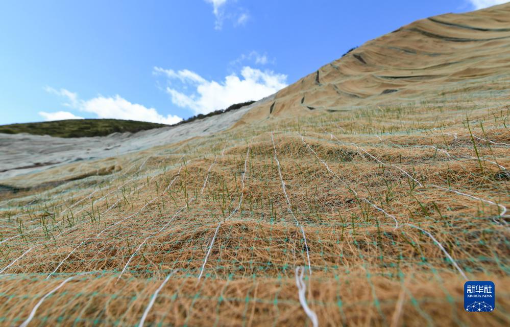 在若爾蓋縣達扎寺鎮多瑪村廢棄礦山治理點,椰絲毯覆蓋下的地表已經萌發出草芽(8月23日攝)。