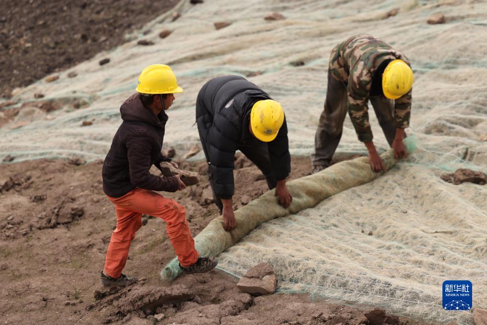 在若爾蓋縣達扎寺鎮多瑪村廢棄礦山治理點,工人在邊坡上鋪椰絲毯(8月23日攝)。