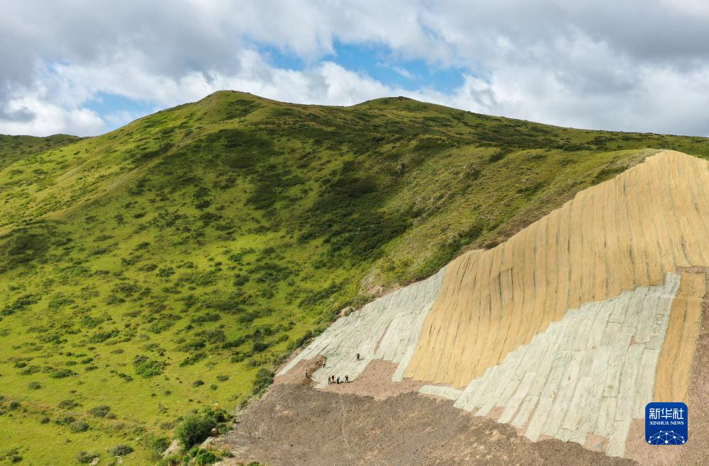 在若爾蓋縣達扎寺鎮多瑪村廢棄礦山治理點,工人在邊坡上鋪椰絲毯(8月23日攝,無人機照片)。
