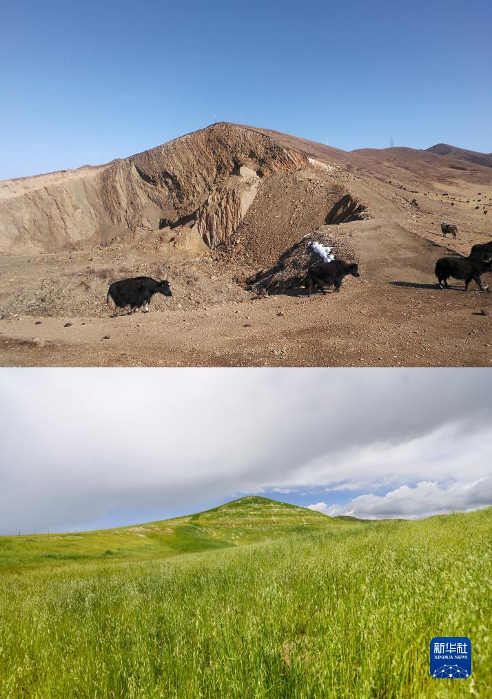 拼版照片:上圖為若爾蓋縣唐克鎮嘎爾瑪村治理前的坡面(3月8日攝,若爾蓋縣自然資源局供圖),下圖為嘎爾瑪村治理后的坡面(新華社記者王曦8月23日攝)。