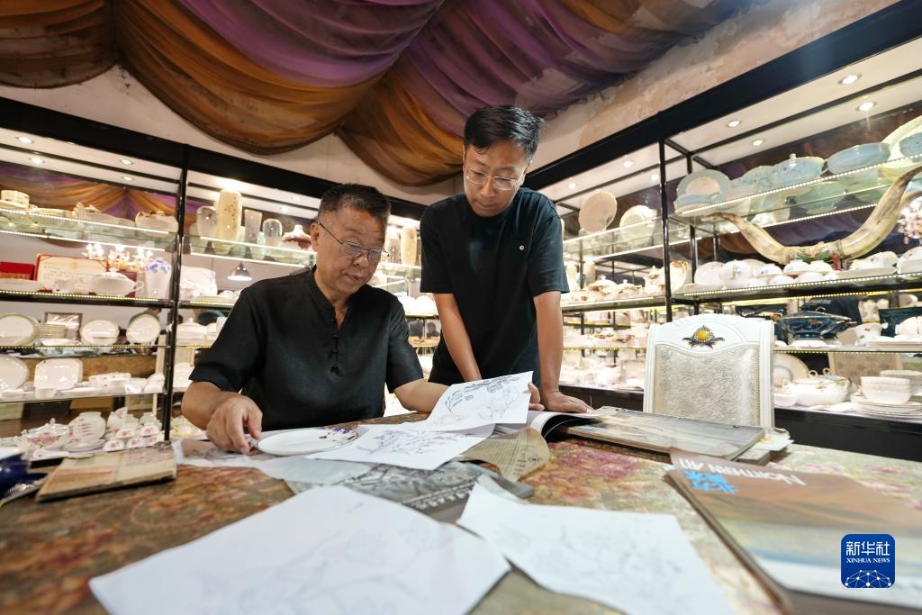 9月12日,戴佩維(左)和兒子戴博霖在研究陶瓷雕金產品制作所用圖紙。