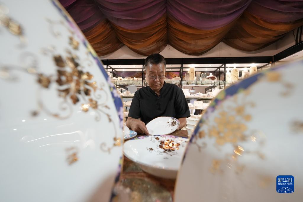 河北省唐山市素有“北方瓷都”的美譽,陶瓷雕金技藝作為陶瓷裝飾技法之一,在當地歷史悠久。唐山市路北區居民戴佩維17歲時進入陶瓷廠學習雕金技藝,經過45年的潛心研究,將傳統技藝與美術繪畫、印刷技術、現代裝飾風格相結合,在普通細白瓷、骨質瓷等眾多瓷種上實現雕金裝飾的藝術創作,使雕金技法更加豐富多彩。2022年,以戴佩維為代表性傳承人的傳統陶瓷雕金技藝被列入唐山市市級非物質文化遺產代表性項目名錄。