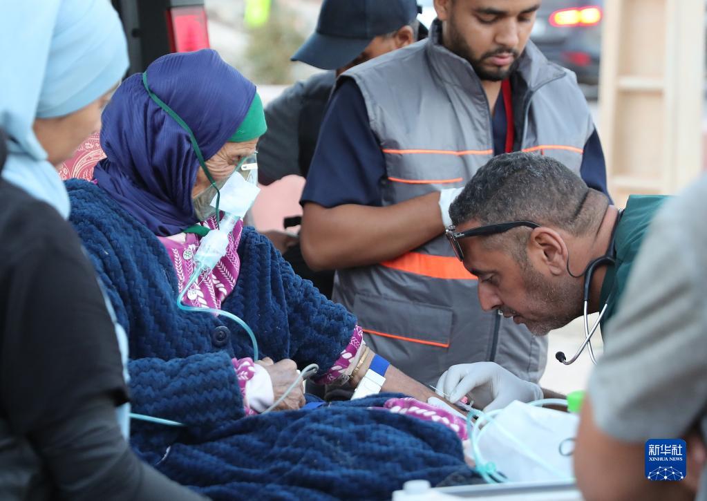 9月12日,在震中區(qū)域的摩洛哥豪茲省塔拉特恩雅庫布村,救援人員救治一名受傷的老人。