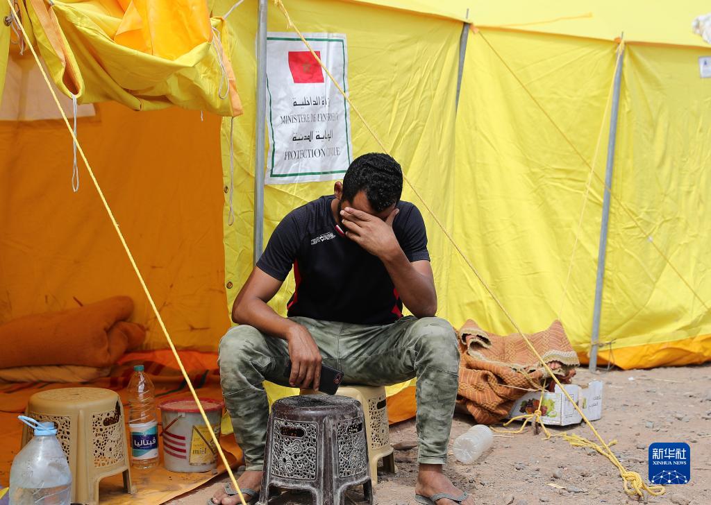 9月12日,一名男子坐在摩洛哥豪茲省的穆萊村的救援帳篷前。