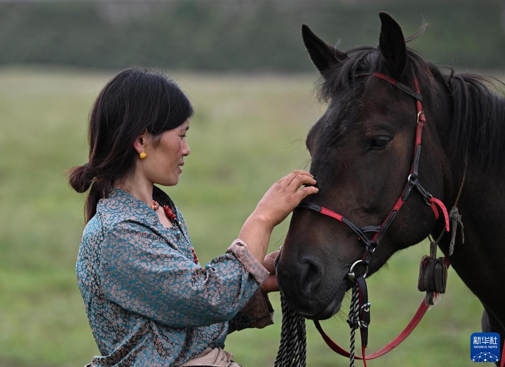 8月17日,在青海省黃南藏族自治州河南蒙古族自治縣多松鄉(xiāng)多松村,扎西曲培的妻子斗格吉在照料一匹馬。新華社記者 張龍 攝