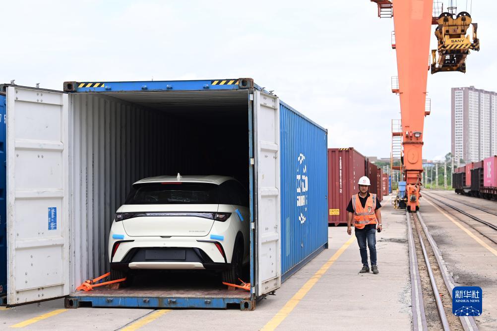 9月13日,在江西贛州國(guó)際陸港,新能源汽車已裝運(yùn)至集裝箱內(nèi)。