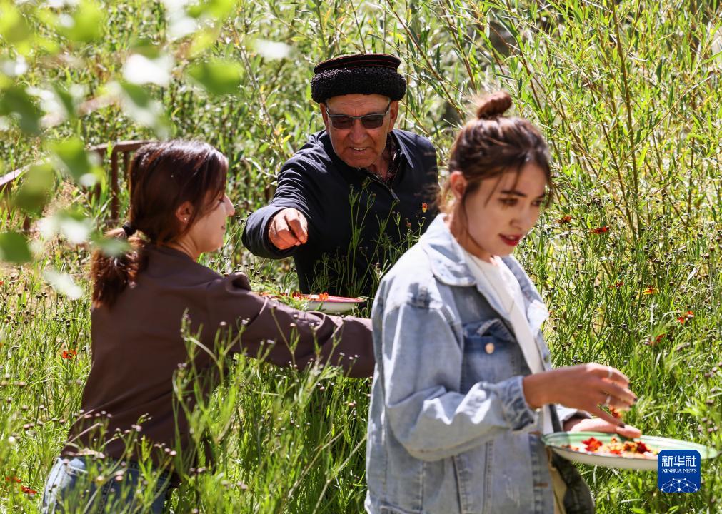 9月4日,村里的年輕人前來巴依卡老人家中,幫助他采摘家里種植的雪菊。新華社記者 蘭紅光 攝