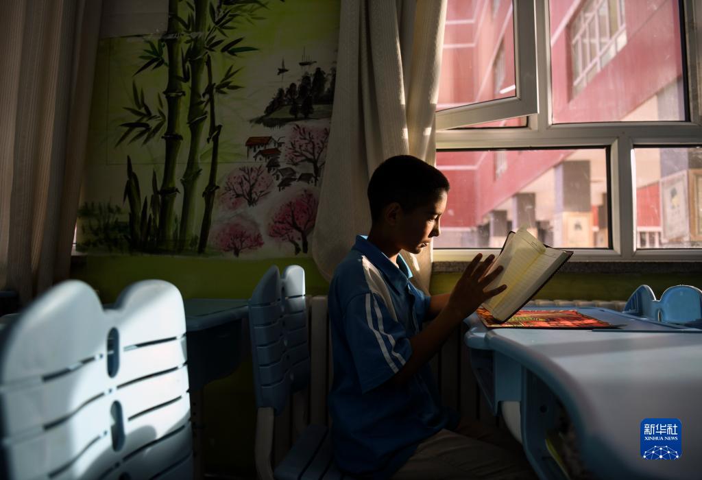 9月7日,在新疆喀什第二中學,拉齊尼的兒子拉迪爾·拉齊尼在收到老師送他的新學年禮物時,撫摸著嶄新的筆記本。新華社記者 王菲 攝