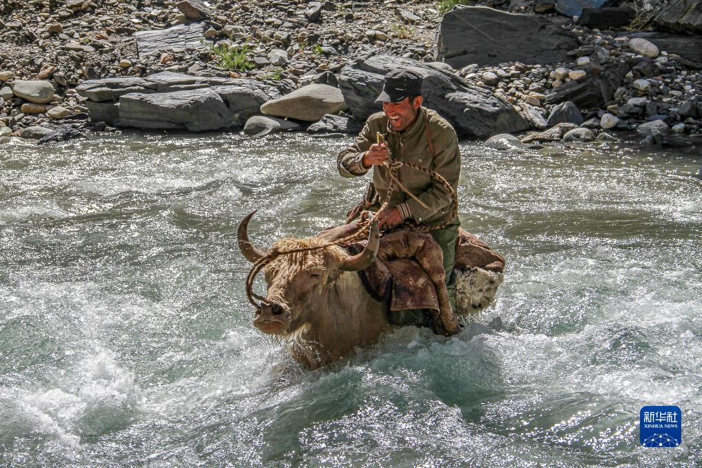 2012年9月21日,拉齊尼騎著牦牛在巡邏路上淌過湍急的河流。新華社發(王烈 攝)