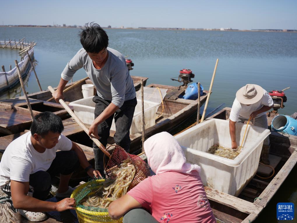 9月13日,養(yǎng)殖戶在河北省滄州市海興縣小山鄉(xiāng)蔡家莊村養(yǎng)殖蝦池收獲對蝦。