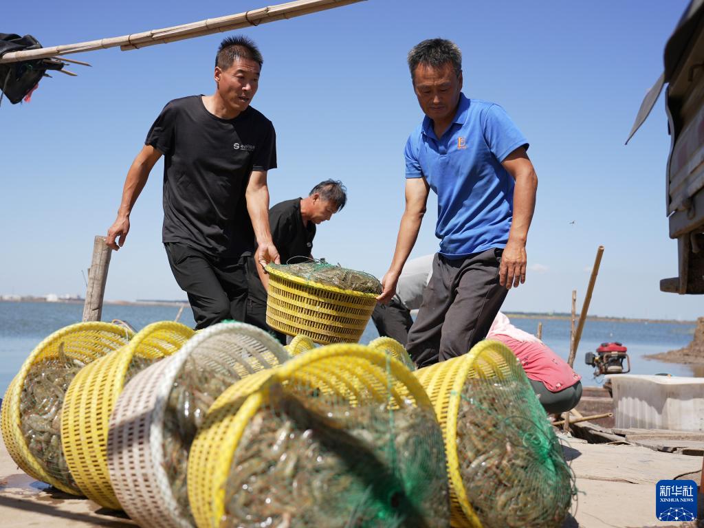 9月13日,養(yǎng)殖戶在河北省滄州市海興縣小山鄉(xiāng)蔡家莊村養(yǎng)殖蝦池搬運(yùn)剛收獲的對(duì)蝦。