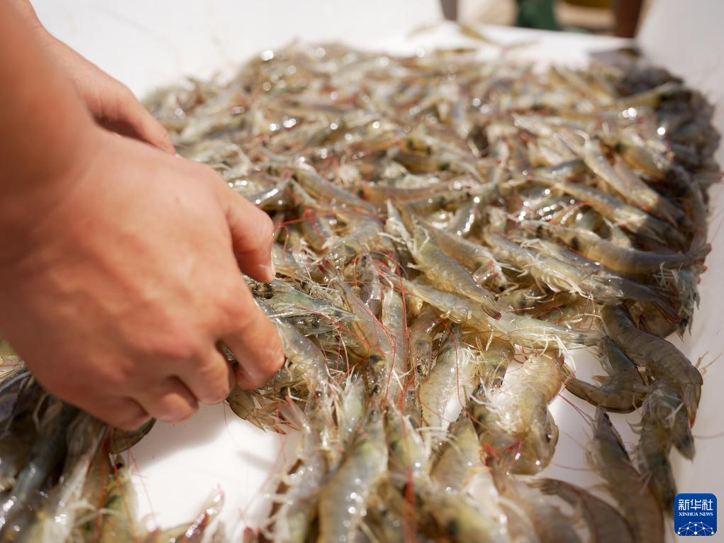 9月13日,養殖戶在河北省滄州市海興縣小山鄉蔡家莊村養殖蝦池分揀對蝦。