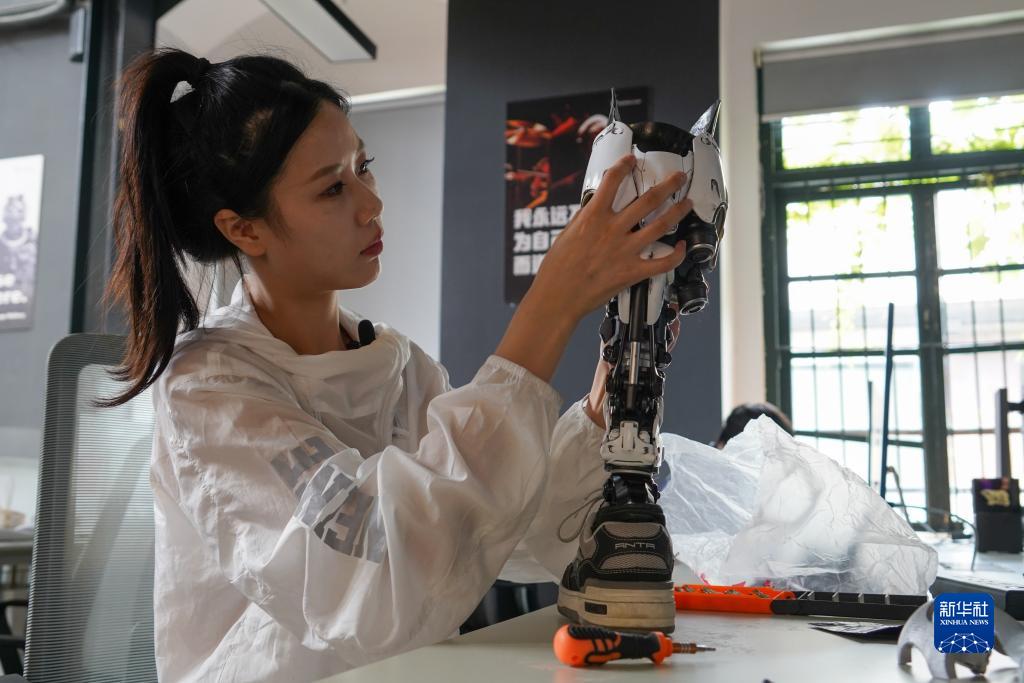 胡月在調(diào)試根據(jù)自己想法設(shè)計的假肢(6月20日攝)。新華社記者 胥冰潔 攝