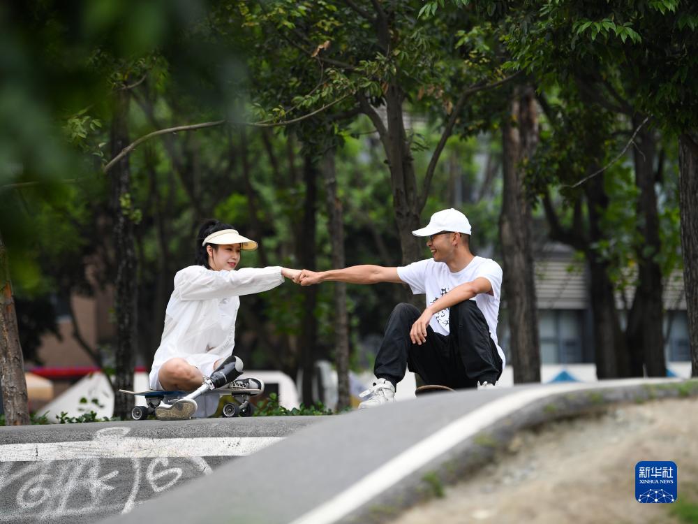 在成都市錦江區(qū)輕極限運(yùn)動(dòng)公園,胡月(左)和滑板愛(ài)好者在交流(6月20日攝)。新華社記者 王曦 攝