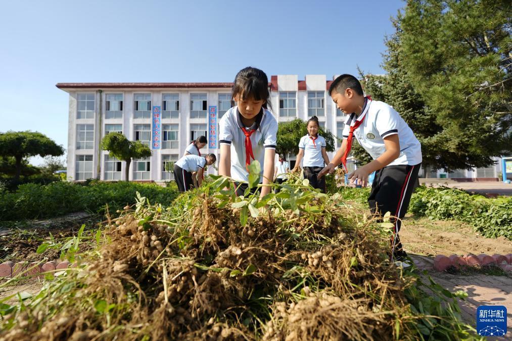 9月13日,河北省樂亭縣汀流河小學(xué)的學(xué)生在“校園農(nóng)場”內(nèi)收獲花生。