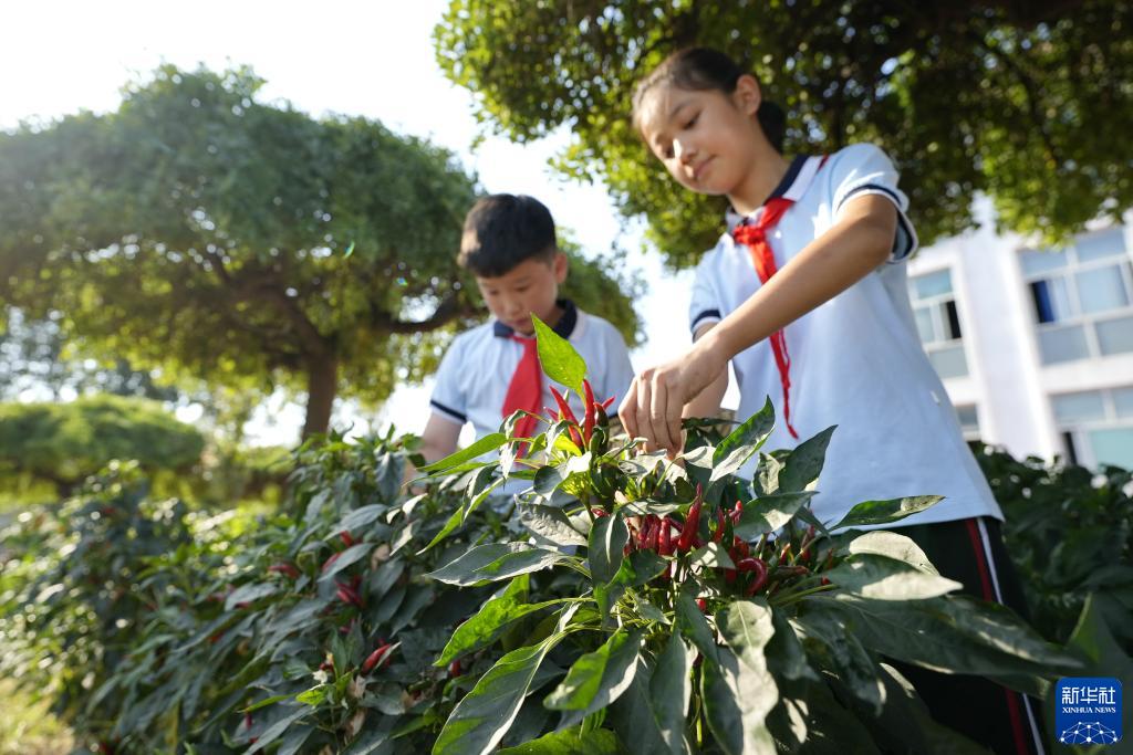 9月13日,河北省樂亭縣汀流河小學的學生在“校園農場”內采摘辣椒。