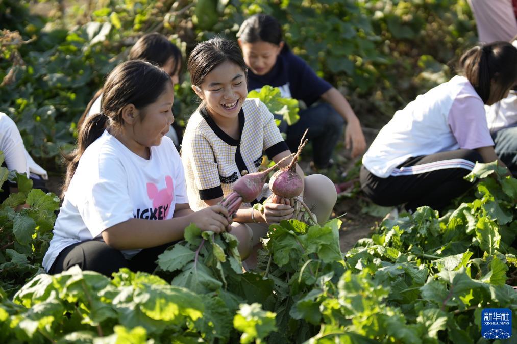 9月13日,河北省樂亭縣新寨鎮(zhèn)蘭坨小學(xué)的學(xué)生在“校園農(nóng)場”內(nèi)收獲蘿卜。