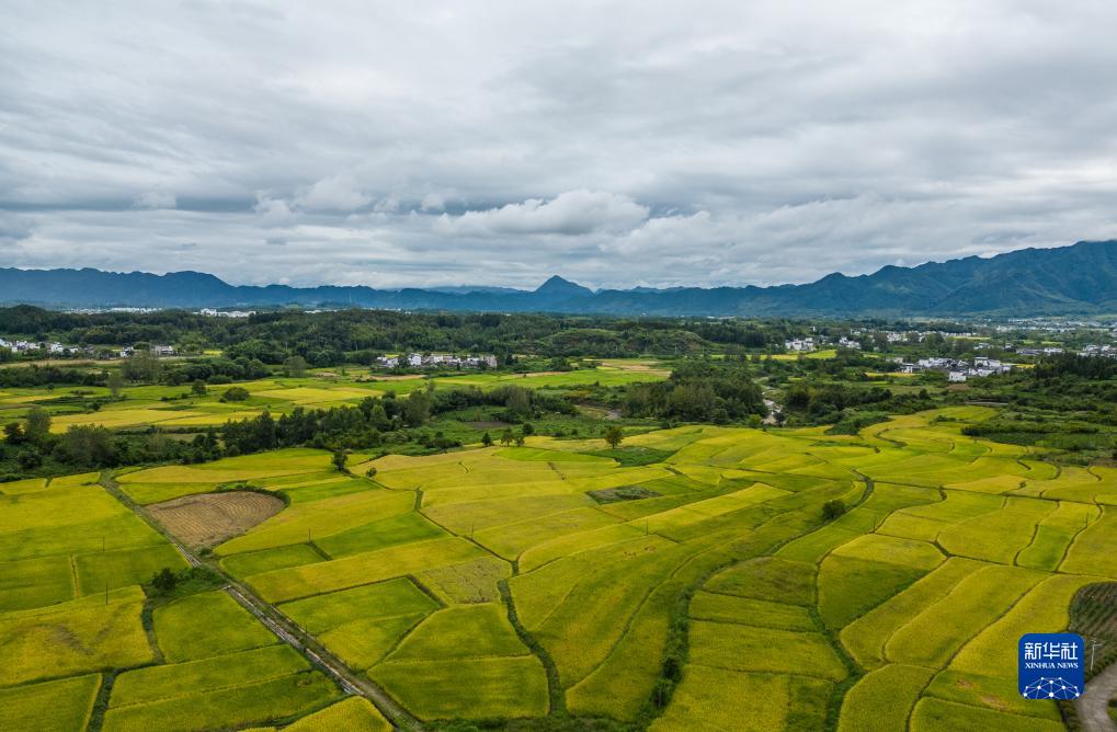 這是9月13日拍攝的黟縣碧陽(yáng)鎮(zhèn)附近的水稻田和徽派民居(無(wú)人機(jī)照片)。