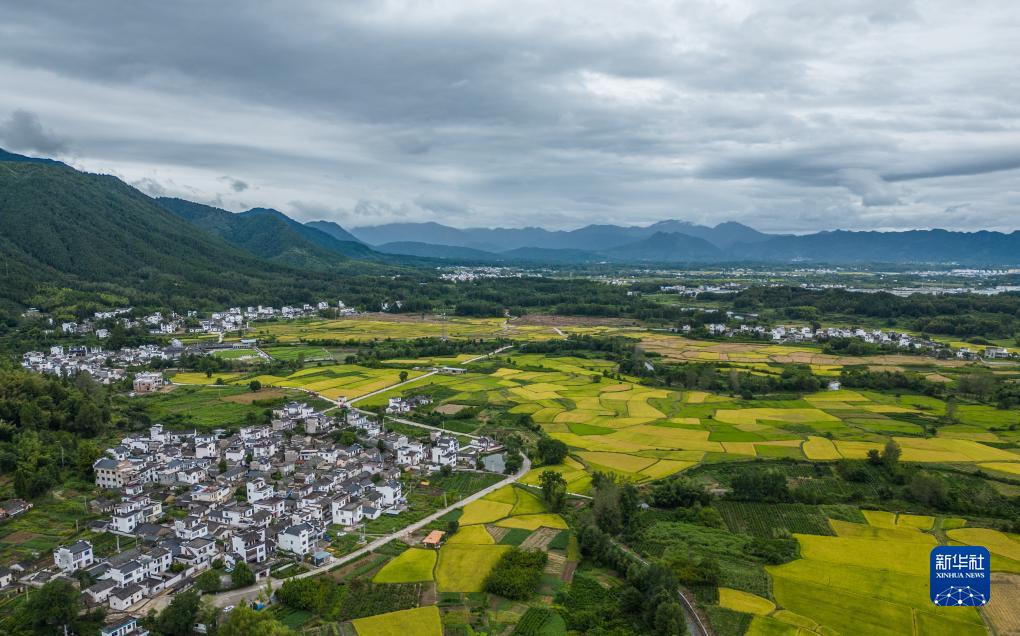 這是9月13日拍攝的黟縣碧陽鎮(zhèn)附近的水稻田和徽派民居(無人機(jī)照片)。