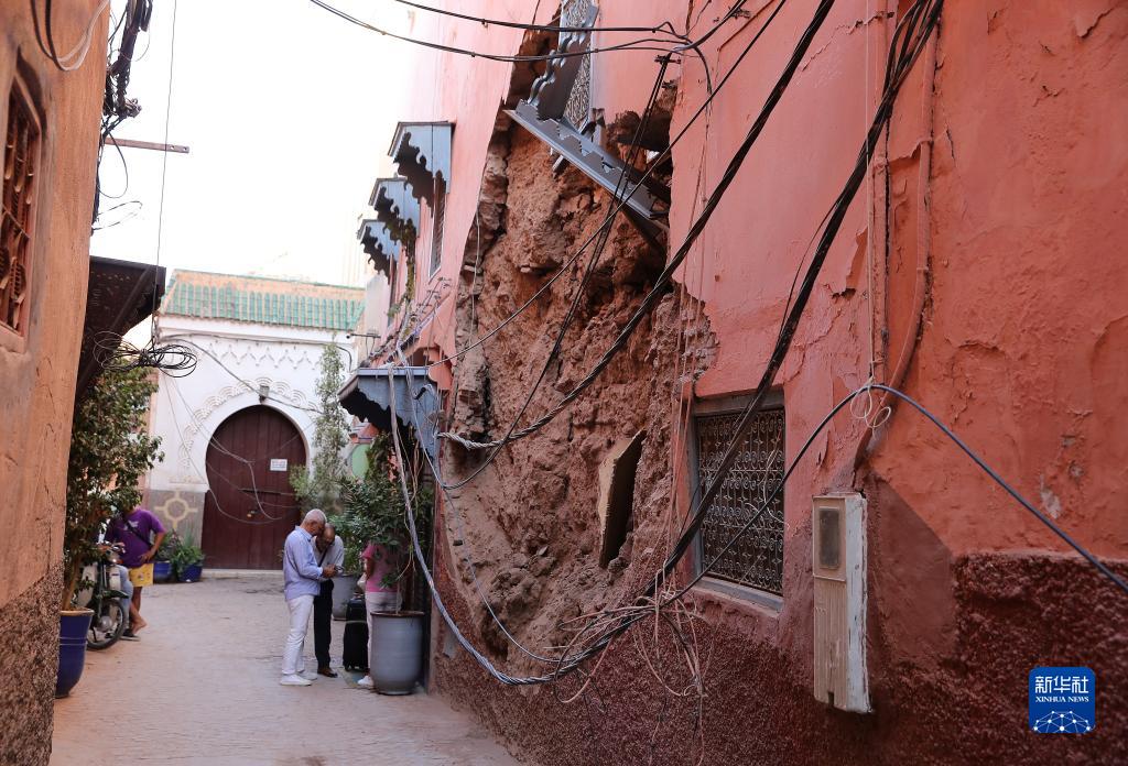 這是9月13日在摩洛哥馬拉喀什老城拍攝的一處震后受損建筑。
