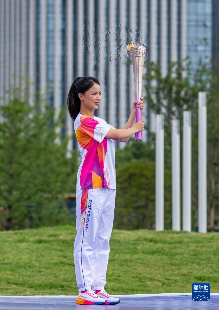 9月14日,在杭州亞運會火炬傳遞臺州站起跑儀式現場,火炬手魏夢喜展示火炬。