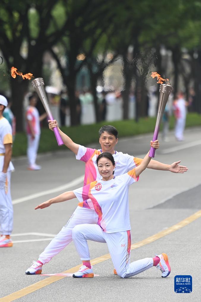 9月14日,火炬手邢艷(前)與陳孝形在火炬傳遞中。