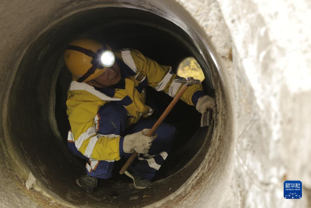 9月13日,中國鐵路哈爾濱局集團有限公司加格達奇工務段的鐵路工人在大興安嶺地區嫩林線路基涵洞進行設備檢查工作。