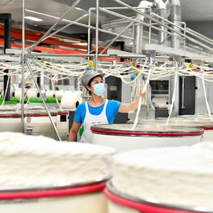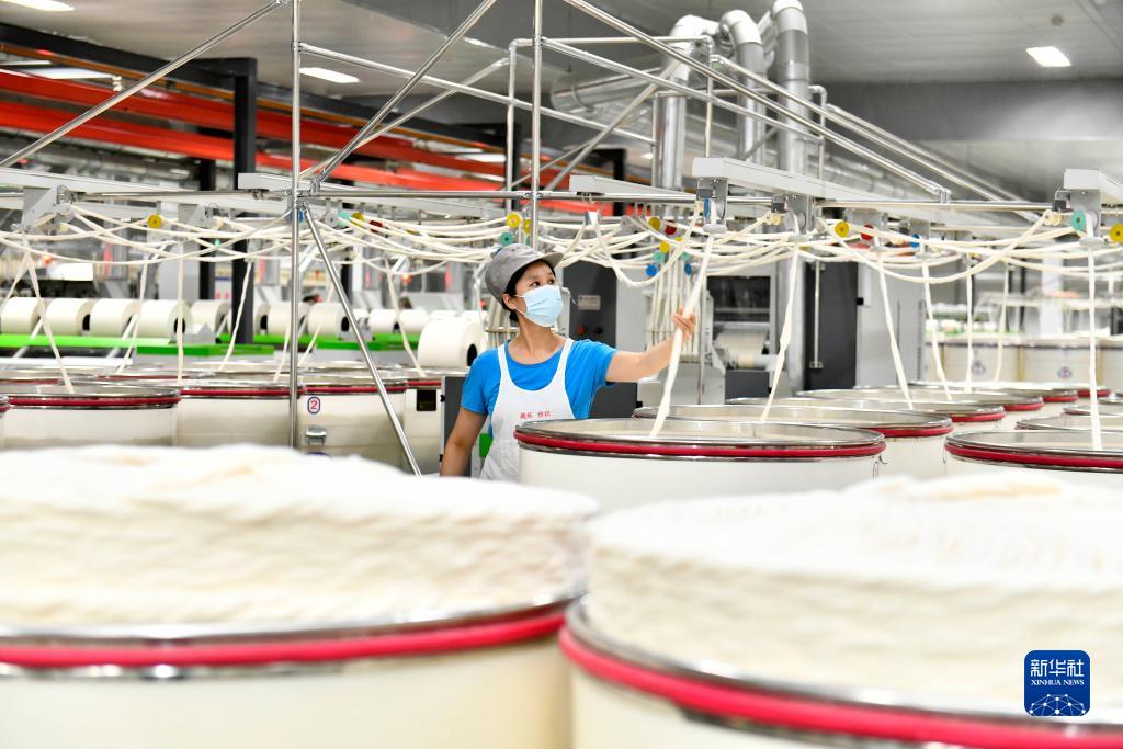 9月13日,在山東宏儒紡織科技有限公司綠色智能化生產車間,工作人員在加工高端紗線。