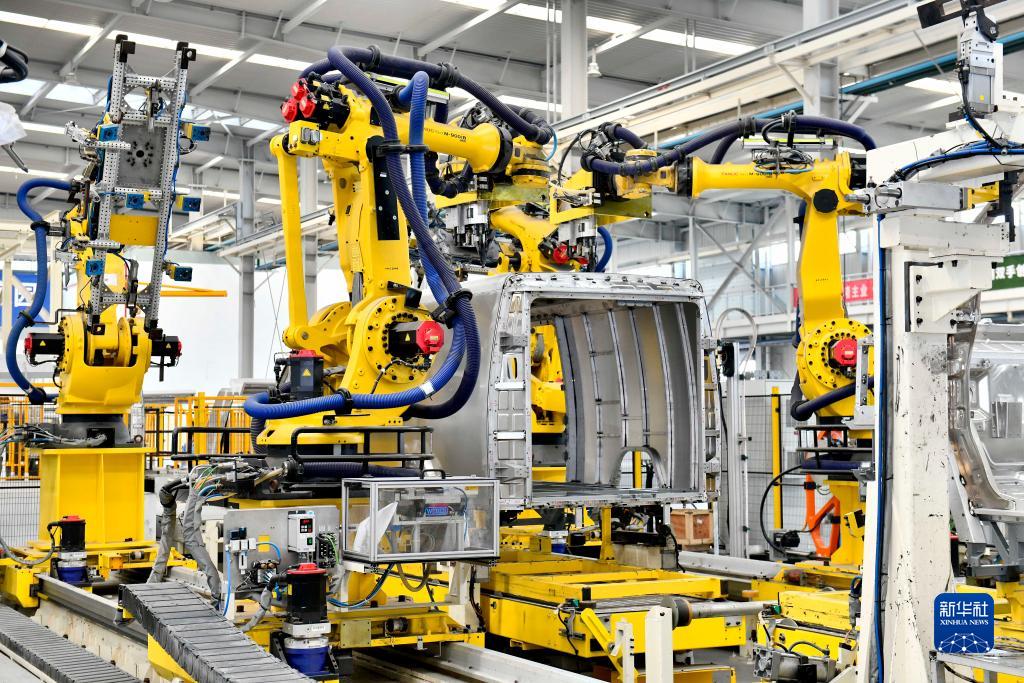 9月13日,在山東鄒平魏橋輕量化基地宏奧全鋁車身集成生產車間,工業機器人在流水線上作業。